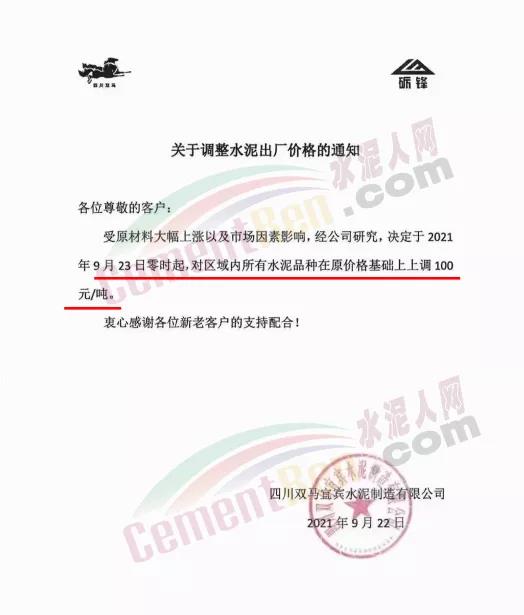 雙馬宜賓水泥通知,9月23日零時(shí)起,水泥價(jià)格上調(diào)100元/噸。