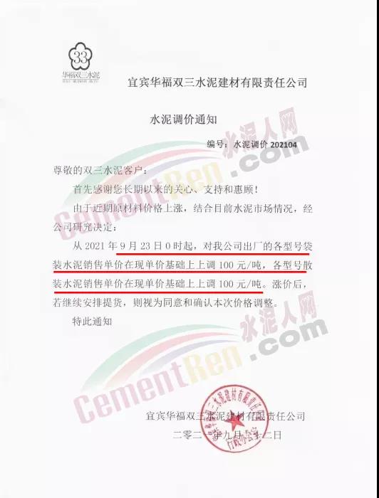 宜賓華福雙三水泥建材有限公司通知9月23日0時(shí)起,水泥價(jià)格上調(diào)100元/噸。