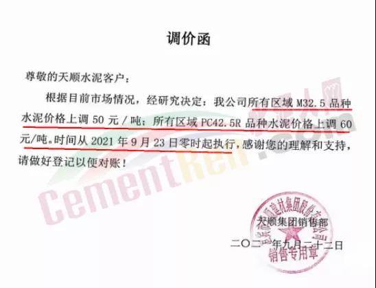 宜賓市天順建材集團(tuán)股份有限公司通知從2021年9月23日零時(shí)起所有區(qū)域M32.5品種水泥價(jià)格上調(diào)50元/噸;所有區(qū)域PC42.5R品種水泥價(jià)格上調(diào)60元/噸。