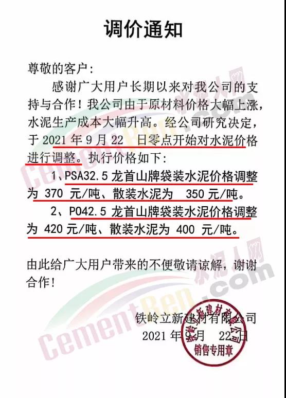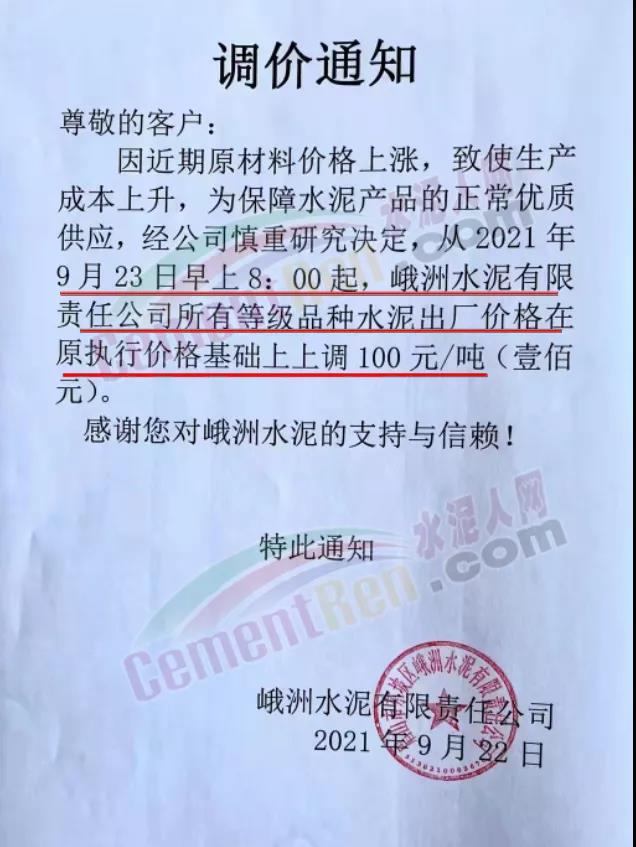 河南省駐馬店市平縣瑞平水泥有限公司通知因原材料上漲,依據(jù)周邊水泥市場(chǎng)行情,經(jīng)公司研究決定,自2021年9月21日上午8時(shí)起,各品牌水泥在原價(jià)基礎(chǔ)上上調(diào)20元/噸。