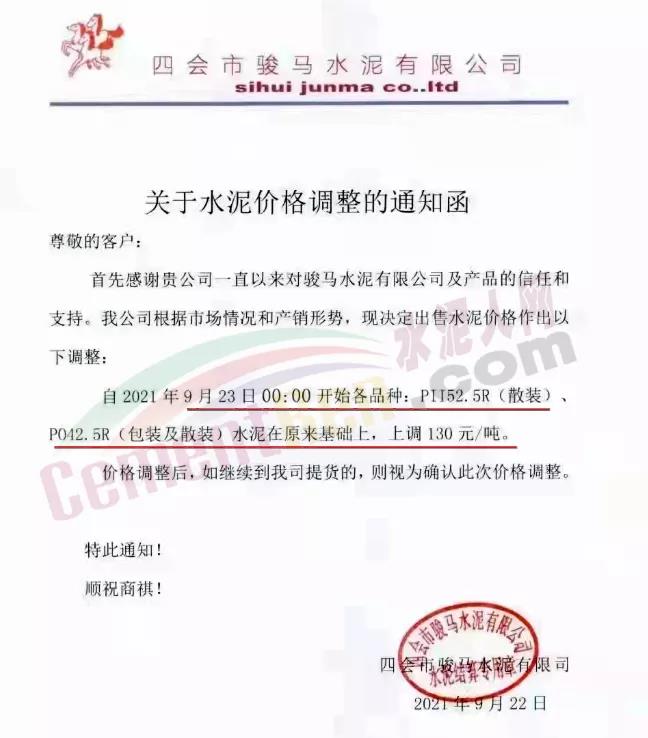 四會(huì)市駿馬水泥有限公司通知根據(jù)市場(chǎng)情況和產(chǎn)銷形勢(shì),決定自2021年9月23日0時(shí)開(kāi)始各PII52.5R(散裝)、PO42.5R(包裝及散裝)水泥在原來(lái)基礎(chǔ)上,上調(diào)130元/噸。