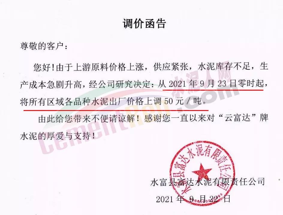 云南省昭通市水富縣富達(dá)水泥有限責(zé)任公司通知由于上游原料價(jià)格上漲,供應(yīng)緊張,水泥庫(kù)存不足,生產(chǎn)成本急劇升高,經(jīng)公司研究決定從2021年9月23日零時(shí)起,將所有區(qū)域各品種水泥出廠價(jià)格上調(diào)50元/噸。