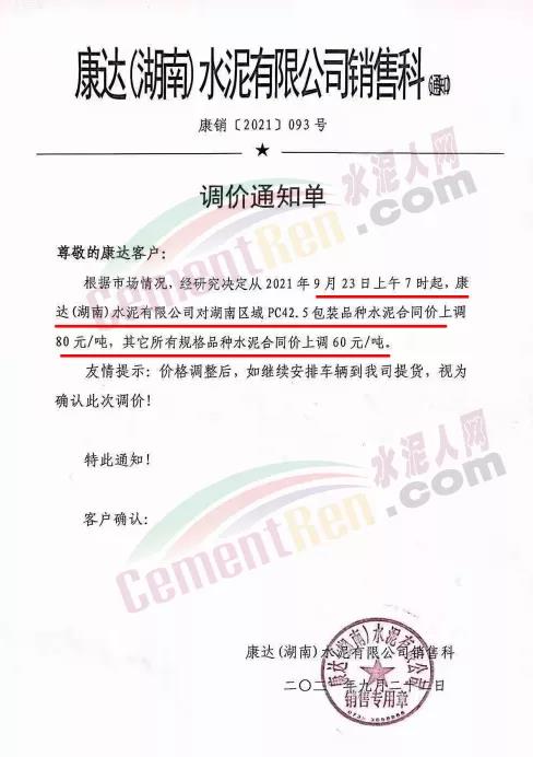 康達(dá)(湖南)水泥有限公司銷售科通知,根據(jù)市場(chǎng)情況,經(jīng)研究決定從2021年9月23日上午7時(shí)起,康達(dá)(湖南)水泥有限公司對(duì)湖南區(qū)域PC42.5包裝品種水泥合同價(jià)上調(diào)80元/噸,其它所有規(guī)格品種水泥合同價(jià)上調(diào)60元/噸。