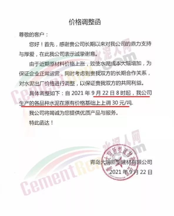 青島大明新型建材有限公司通知由于近期原材料價(jià)格上漲,致使水泥成本大幅增加,為保證企業(yè)正常運(yùn)營(yíng),自2021年9月22日8時(shí)起,公司生產(chǎn)的各品種水泥在原有價(jià)格基礎(chǔ)上上調(diào)30元/噸。
