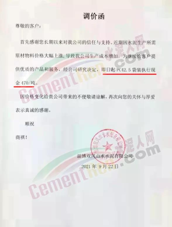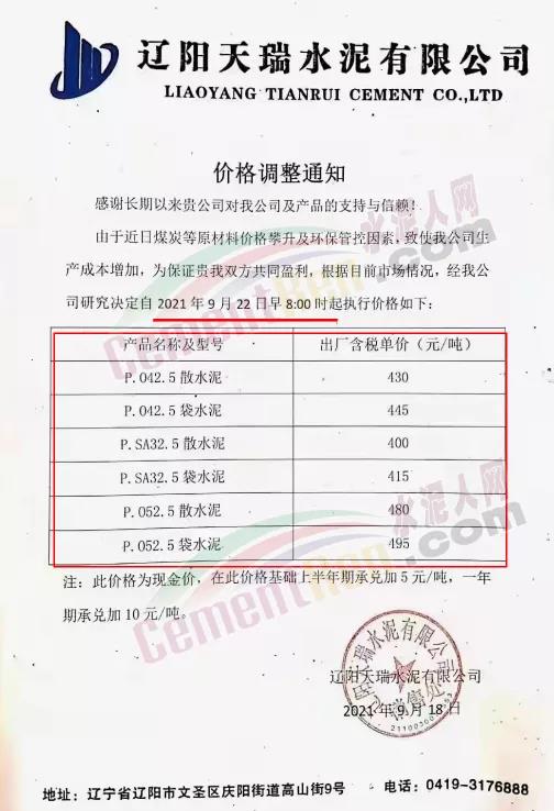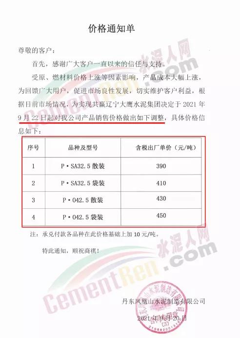 丹東鳳凰山水泥通知,自9月22日起調(diào)整水泥價(jià)格,P.O42.5散裝水泥調(diào)整為430元/噸,承兌付款在此價(jià)格基礎(chǔ)上加10元/噸。