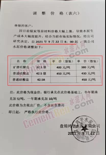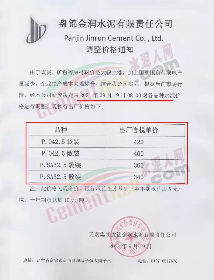 盤(pán)錦金潤(rùn)水泥通知,9月19日起調(diào)整水泥價(jià)格,PO42.5散裝水泥報(bào)價(jià)400元/噸。