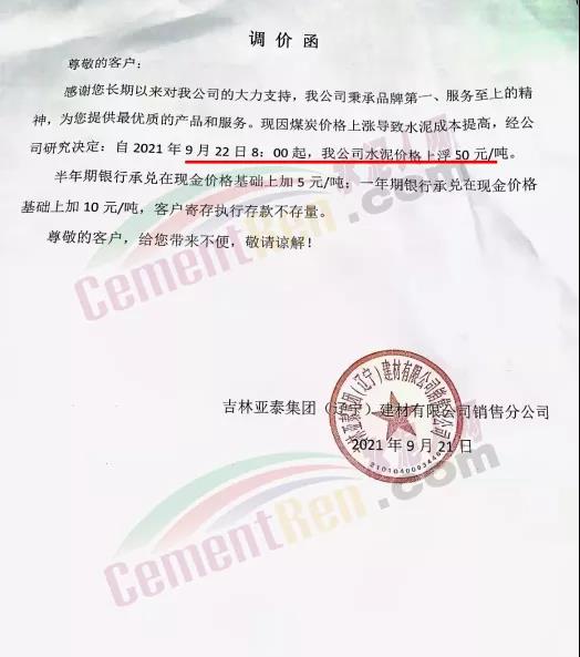 吉林亞泰企業(yè)遼寧公司通知,9月22日起,公司水泥價(jià)格上浮50元/噸。