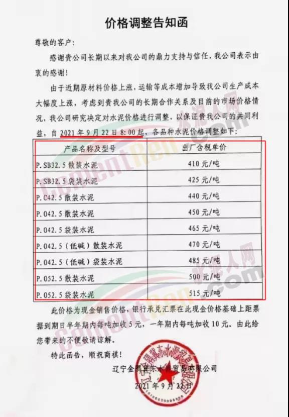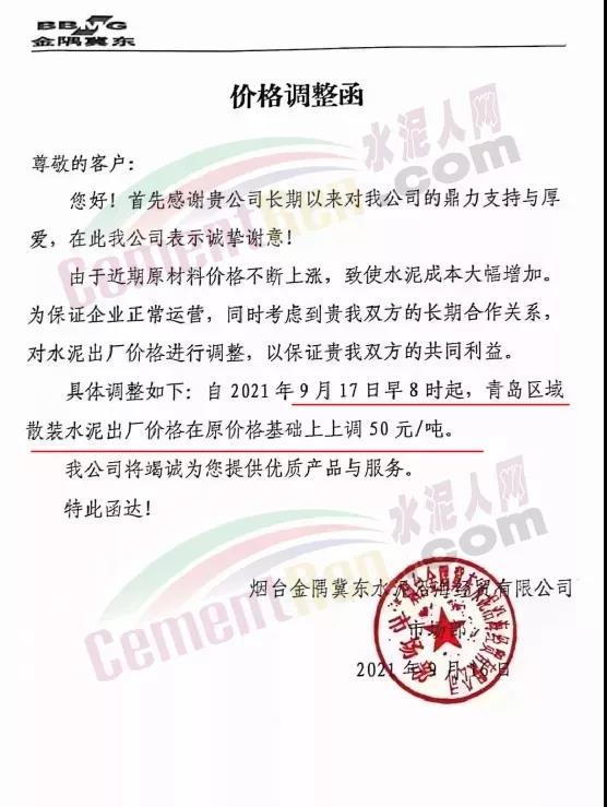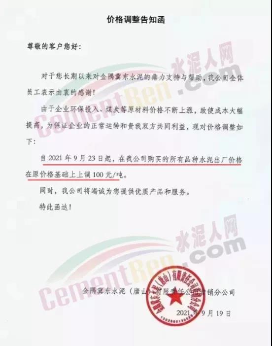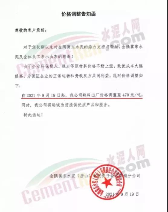 金隅冀東水泥(唐山)有限責(zé)任公司自2021年9月23日起所有品種水泥出廠價(jià)格在原價(jià)格基礎(chǔ)上上調(diào)100元/噸;熟料出廠價(jià)調(diào)整至470元/噸。
