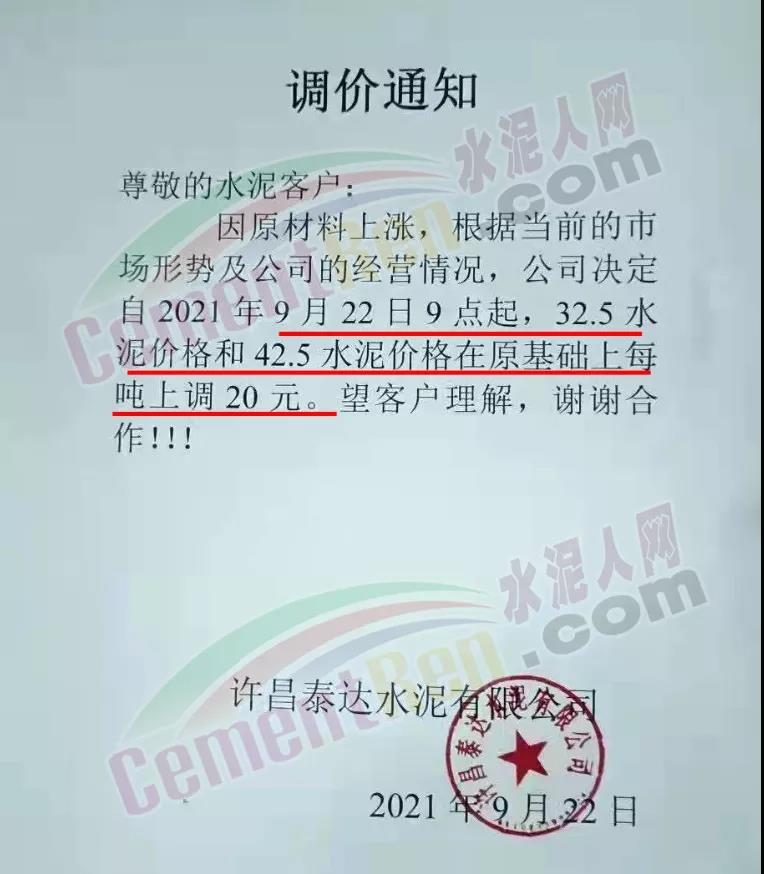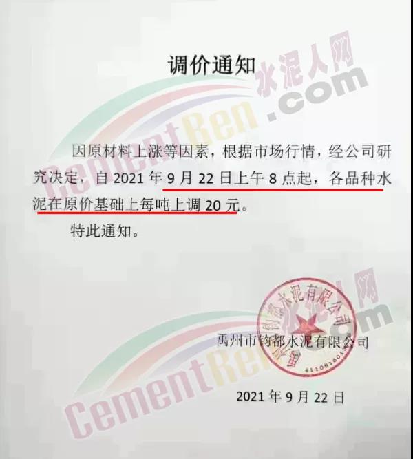 禹州市鈞都水泥有限公司通知因原材料上漲等因素,根據(jù)市場(chǎng)行情,經(jīng)公司研究決定,自2021年9月22日上午8點(diǎn)起,各品種水泥在原價(jià)基礎(chǔ)上每噸上調(diào)20元。
