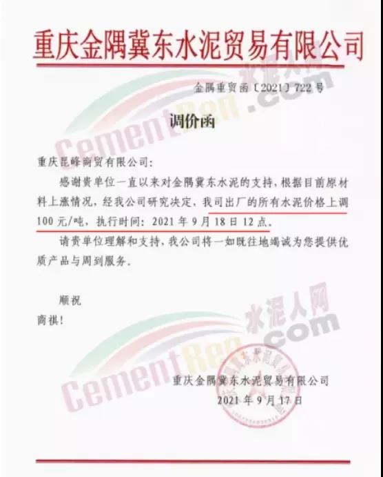重慶金隅冀東水泥貿(mào)易有限公司通知,自2021年9月18日12點(diǎn)所有水泥價(jià)格上調(diào)100元/噸。