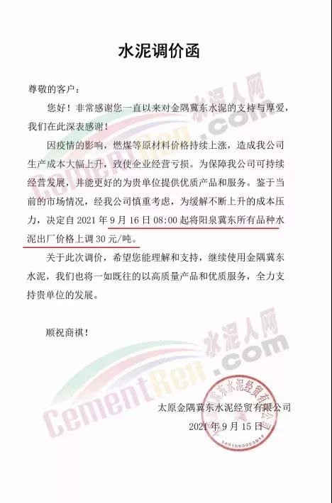 山西太原金隅冀東水泥經(jīng)貿(mào)有限公司通知,因疫情的影響,燃煤等原材料價(jià)格持續(xù)上漲,造成公司生產(chǎn)成本大幅上升,致使企業(yè)經(jīng)營(yíng)虧損。為保障公司可持續(xù)經(jīng)營(yíng)發(fā)展,并能更好的為貴單位提供優(yōu)質(zhì)產(chǎn)品和服務(wù)。鑒于當(dāng)前的市場(chǎng)情況,經(jīng)公司慎重考慮,為緩解不斷上升的成本壓力,決定自2021年9月16日08∶00起將陽(yáng)泉冀東所有品種水泥出廠價(jià)格上調(diào)30元/噸。