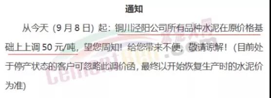 9月8日,陜西關(guān)中地區(qū)冀東水泥涇陽(yáng)公司通知上調(diào)各標(biāo)號(hào)水泥價(jià)格50元/噸。