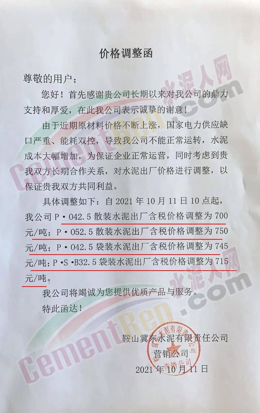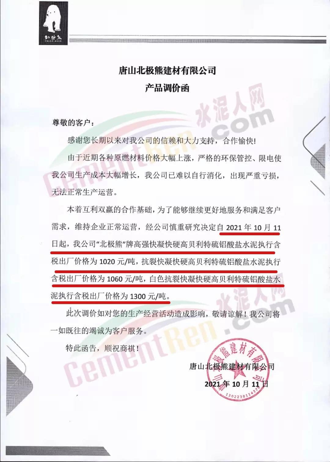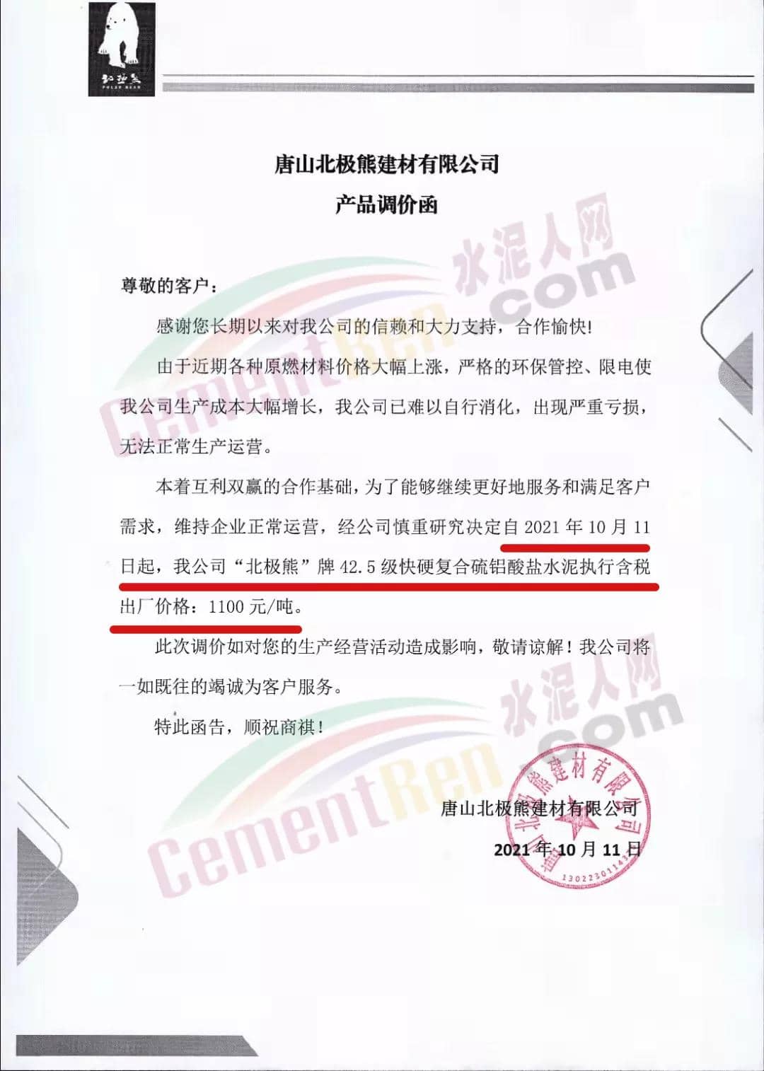 10月11日唐山北極熊建材有限公司發(fā)布通知稱:本著互利雙贏的合作基礎(chǔ),為了能夠繼續(xù)更好地服務(wù)和滿足客戶需求,維持企業(yè)正常運(yùn)營(yíng),經(jīng)公司慎重研究決定自2021年10月11日起,調(diào)整產(chǎn)品價(jià)格。調(diào)價(jià)后旗下“北極熊”品牌水泥價(jià)格最高達(dá)1300元/噸。