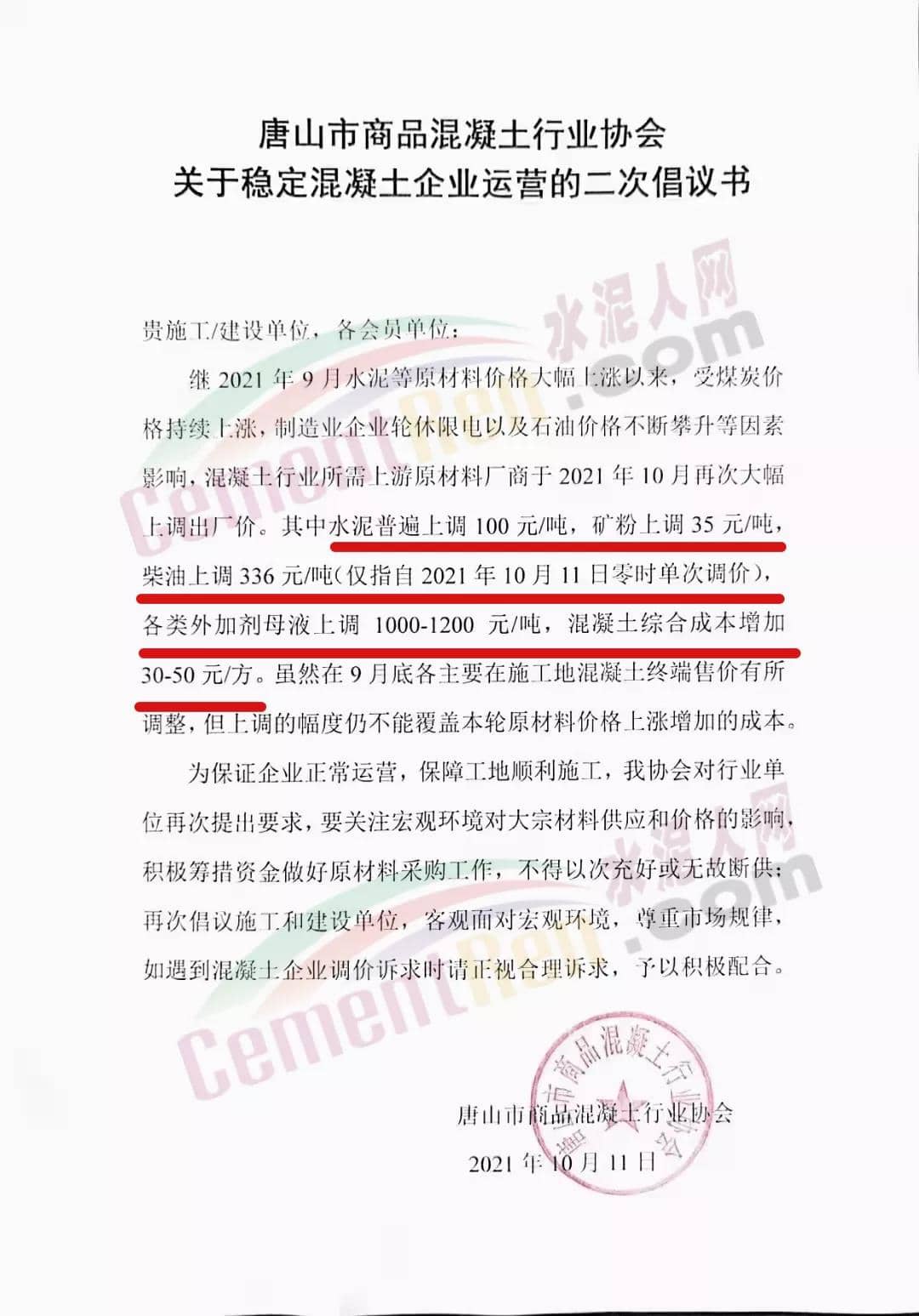 同日,唐山市商品混凝土行業(yè)協(xié)會(huì)發(fā)布《關(guān)于穩(wěn)定混凝土企業(yè)運(yùn)營(yíng)的二次倡議書》給各施工/建設(shè)單位及會(huì)員單位稱,繼2021年9月水泥等原材料價(jià)格大幅上漲以來(lái),受煤炭?jī)r(jià)格持續(xù)上漲,制造業(yè)企業(yè)輪休限電以及石油價(jià)格不斷攀升等因素影響,混凝土行業(yè)所需上游原材料廠商于2021年10月再次大幅上調(diào)出廠價(jià)。其中水泥普遍上調(diào)100元/噸,礦粉上調(diào)35元/噸,柴油上調(diào)336元/噸(僅指自2021年10月11日零時(shí)單次調(diào)價(jià)),各類外加劑母液上調(diào)1000-1200元/噸,混凝土綜合成本增加30-50元/方。雖然在9月底各主要在施工地混凝土終端售價(jià)有所調(diào)整,但上調(diào)的幅度仍不能覆蓋本輪原材料價(jià)格上漲增加的成本。