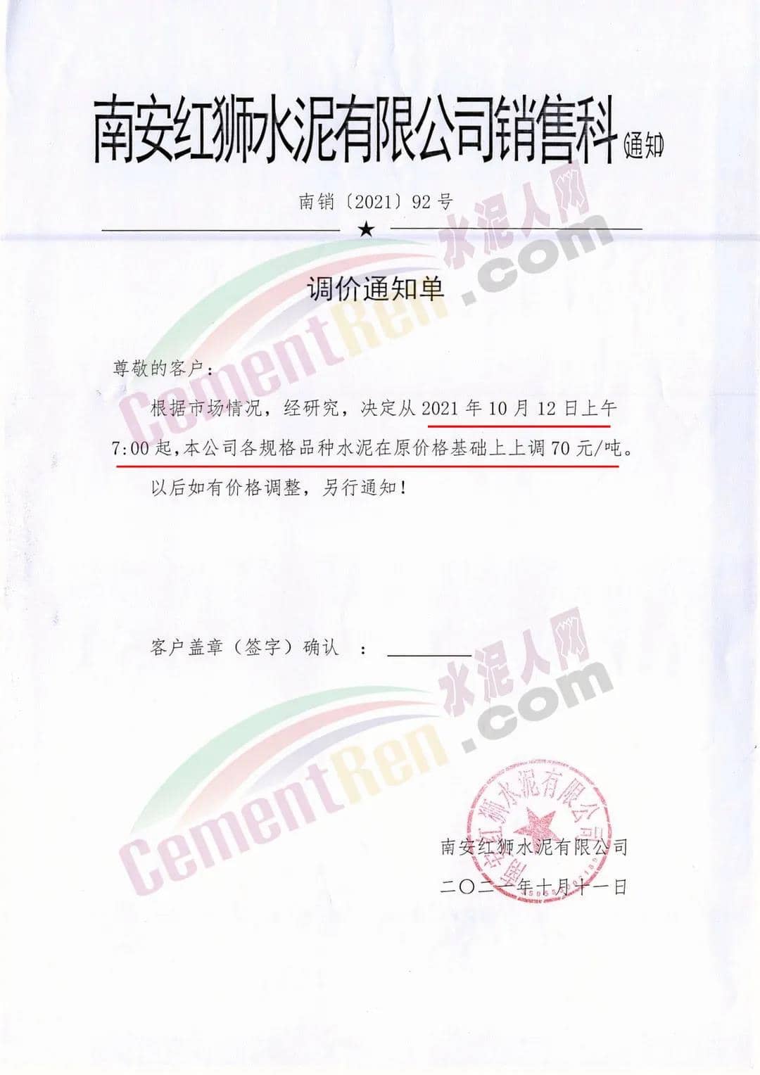 福建泉州南安紅師水泥有限公司銷售科通知,根據(jù)市場(chǎng)情況,經(jīng)研究決定從2021年10月12日上午7時(shí)起,各規(guī)格品種水泥在原價(jià)格基礎(chǔ)上上調(diào)70元/噸。