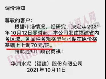 華潤(rùn)水泥(福建)股份有限公司通知根據(jù)市場(chǎng)情況,經(jīng)研究決定從2021年10月12日零時(shí)起,發(fā)往福建省內(nèi)各區(qū)域,各品種各規(guī)格型號(hào)水泥在原價(jià)格基礎(chǔ)上上調(diào)70元/噸。