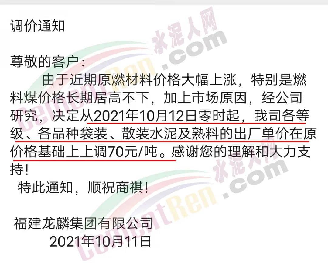 福建龍麟集團(tuán)有限公司通知,由于近期原燃材料價(jià)格大幅上漲,特別是燃料煤價(jià)格長(zhǎng)期居高不下,加上市場(chǎng)原因,經(jīng)公司研究,決定從2021年10月12日零時(shí)起,公司各等級(jí)、各品種袋裝、散裝水泥及熟料的出廠單價(jià)在原價(jià)格基礎(chǔ)上上調(diào)70元/噸。