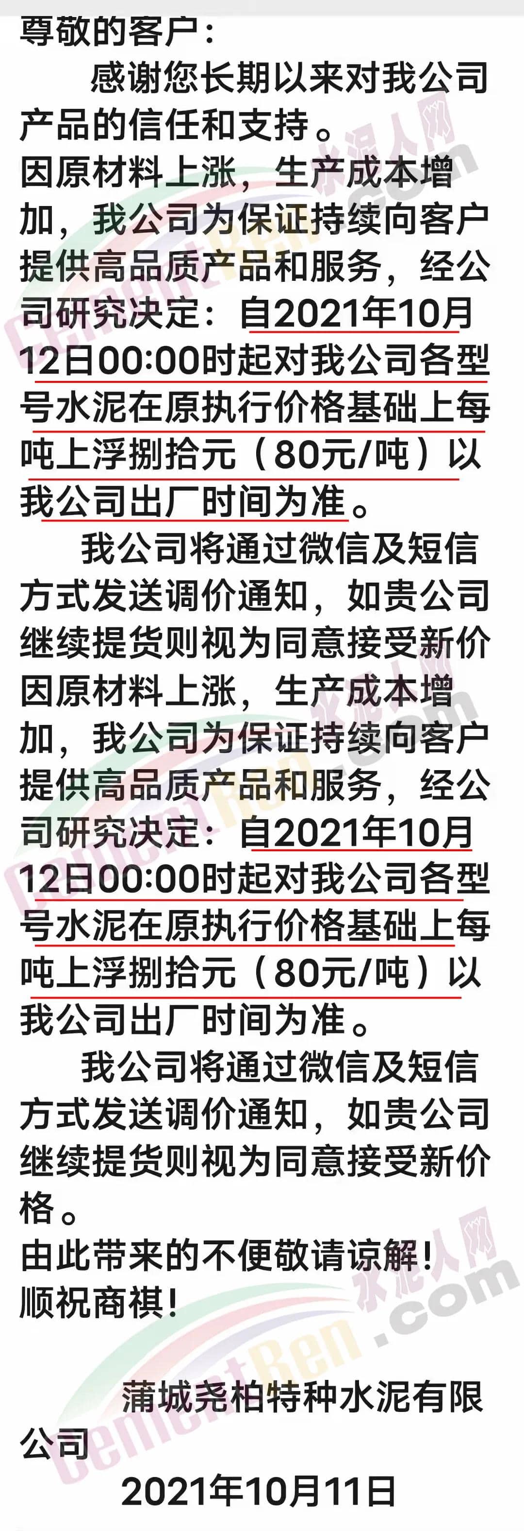蒲城堯柏特種水泥有限公司通知,因原材料上漲,生產(chǎn)成本增加,公司為保證持續(xù)向客戶提供高品質(zhì)產(chǎn)品和服務(wù),經(jīng)公司研究決定,自2021年10月12日0時(shí)起對(duì)公司各型號(hào)水泥在原執(zhí)行價(jià)格基礎(chǔ)上上浮80元/噸。