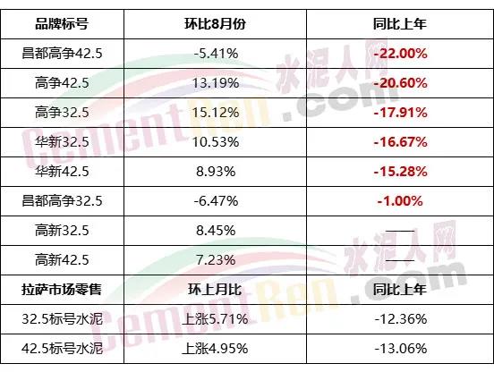 據(jù)西藏自治區(qū)發(fā)改委公開數(shù)據(jù)顯示,9月份水泥非重點(diǎn)項(xiàng)目出廠價(jià)格與上年同期相比跌幅最高達(dá)到22%。42.5標(biāo)號(hào)水泥拉薩市場(chǎng)平均零售價(jià)下跌13.06%。