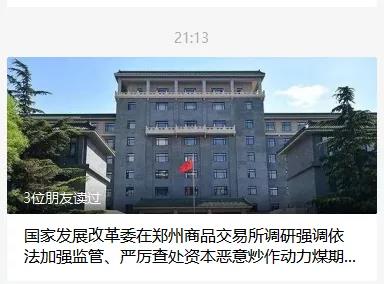 21:13分《國家發(fā)展改革委在鄭州商品交易所調(diào)研強(qiáng)調(diào)依法加強(qiáng)監(jiān)管、嚴(yán)厲查處資本惡意炒作動(dòng)力煤期貨》提到,發(fā)改委將嚴(yán)厲查處資本惡意炒作動(dòng)力煤期貨。