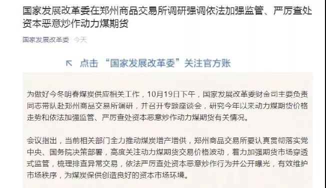據(jù)了解,10月19日下午,國家發(fā)展改革委財(cái)金司主要負(fù)責(zé)同志帶隊(duì)赴鄭州商品交易所調(diào)研,并召開專題座談會(huì),研究今年以來動(dòng)力煤期貨價(jià)格走勢(shì)和依法加強(qiáng)監(jiān)管、嚴(yán)厲查處資本惡意炒作動(dòng)力煤期貨有關(guān)情況。
