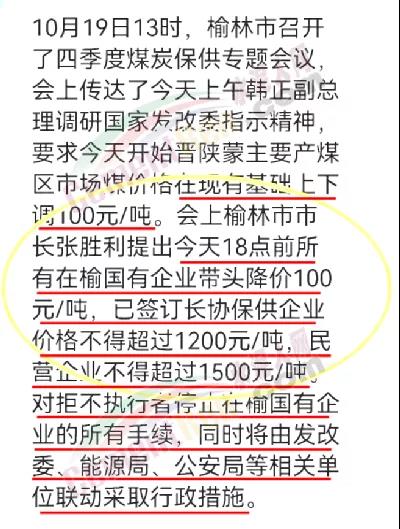 10月19日13時(shí),榆林市召開了四季度煤炭保供專題會(huì)議,會(huì)上傳達(dá)了當(dāng)日上午韓正副總理調(diào)研國家發(fā)改委指示精神,要求晉陜蒙主要產(chǎn)煤區(qū)市場(chǎng)煤價(jià)格在現(xiàn)有基礎(chǔ)上下調(diào)100元/噸。會(huì)上榆林市市長(zhǎng)張勝利提出19日18點(diǎn)前所有在榆國有企業(yè)帶頭降價(jià)100元/噸,已簽訂長(zhǎng)協(xié)保供企業(yè)價(jià)格不得超過1200元/噸,民營(yíng)企業(yè)不得超過1500元/噸。對(duì)拒不執(zhí)行者停止在榆國有企業(yè)的所有手續(xù),同時(shí)將由發(fā)改委、能源局、公安局等相關(guān)單位聯(lián)動(dòng)采取行政措施。