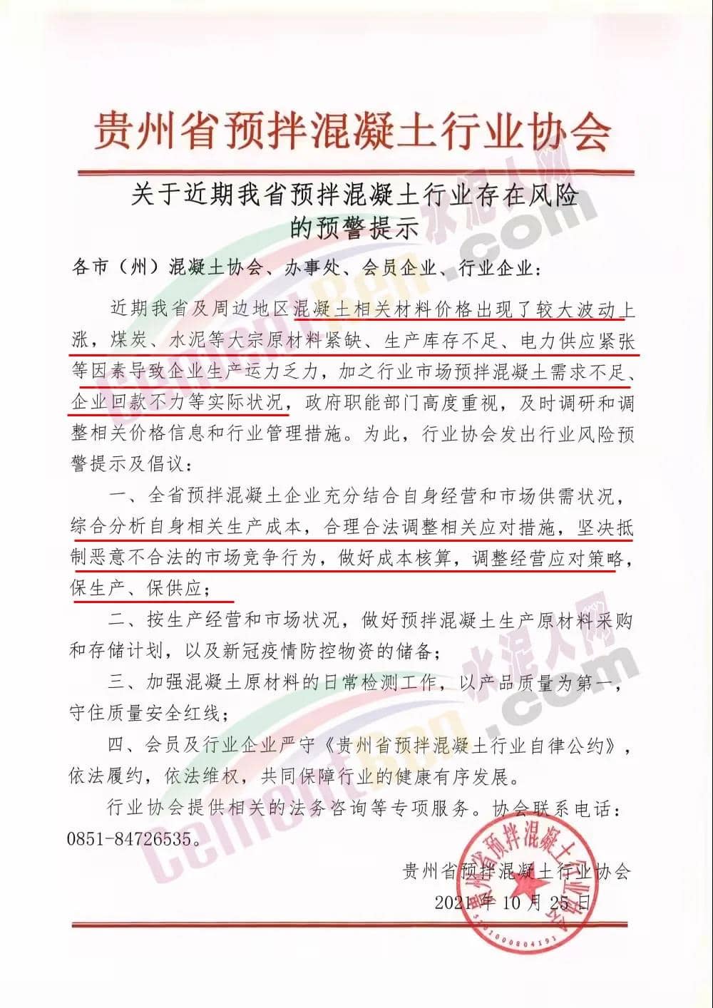 25日,貴州省預(yù)拌混凝土行業(yè)協(xié)會(huì)發(fā)布《關(guān)于近期我省預(yù)拌混凝土行業(yè)存在風(fēng)險(xiǎn)的預(yù)警提示》稱,近期貴州省及周邊地區(qū)混凝土相關(guān)材料價(jià)格出現(xiàn)了較大波動(dòng)上漲,煤炭、水泥等大宗原材料緊缺、生產(chǎn)庫(kù)存不足、電力供應(yīng)緊張等因素導(dǎo)致企業(yè)生產(chǎn)運(yùn)力乏力,加之行業(yè)市場(chǎng)預(yù)拌混凝土需求不足、企業(yè)回款不力等實(shí)際狀況,政府職能部門高度重視,及時(shí)調(diào)研和調(diào)整相關(guān)價(jià)格信息和行業(yè)管理措施。