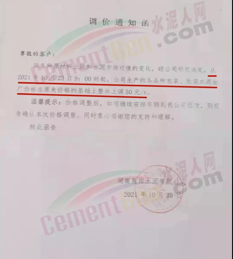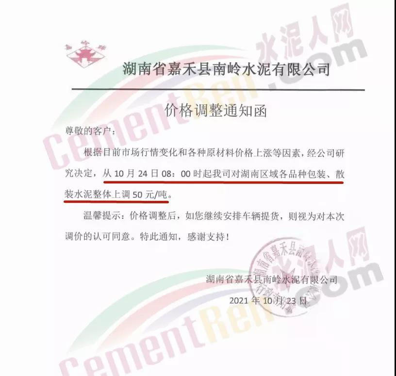 湖南省嘉禾縣南嶺水泥有限公司通知,根據(jù)目前市場(chǎng)行情變化和各種原材料價(jià)格上漲等因素,經(jīng)公司研究決定從10月24日8時(shí)起,對(duì)湖南區(qū)域各品種包裝、散裝水泥整體上調(diào)50元/噸。