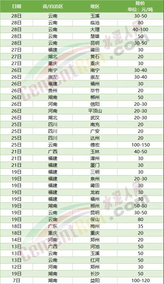 福建省內(nèi)福州、莆田等區(qū)域已經(jīng)連續(xù)兩次下調(diào)水泥價格,累計下調(diào)60元/噸。重慶兩次累計下調(diào)50元/噸。