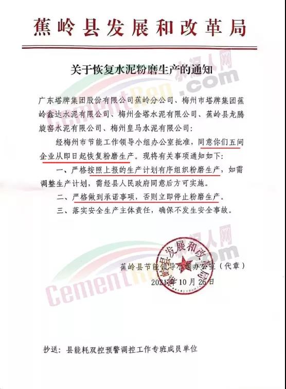 日前,廣東省梅州市蕉嶺縣發(fā)改局發(fā)布《關于恢復水泥粉磨生產(chǎn)的通知》給廣東塔牌集團股份有限公司蕉嶺分公司、梅州市塔牌集團蕉嶺鑫達水泥有限公司、梅州金塔水泥有限公司、蕉嶺縣龍騰旋窯水泥有限公司、梅州皇馬水泥有限公司五家企業(yè)稱,經(jīng)梅州市節(jié)能工作領導小組辦公室批準,同意上述五家企業(yè)從即日起恢復粉磨生產(chǎn)。
