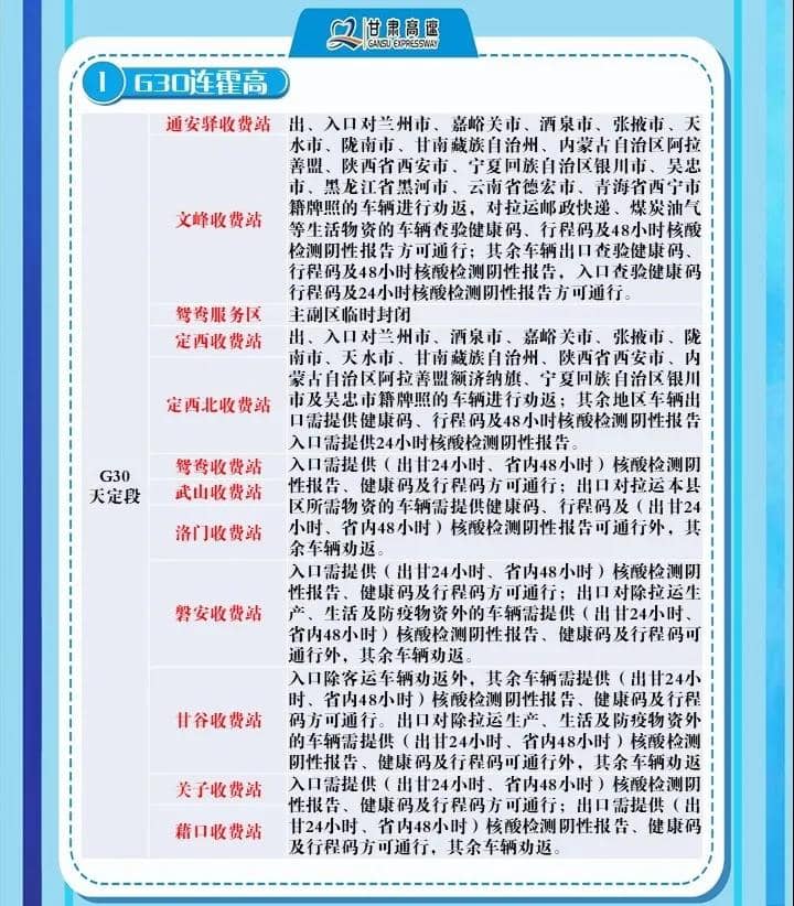 1、G6京藏高速,平西路段平安收費(fèi)站入口車輛監(jiān)測人員登記后進(jìn)入高速;出口車輛持48小時核酸檢測報告、掃兩碼后通行,西寧車輛勸返。高寨匝道入口交通管制。