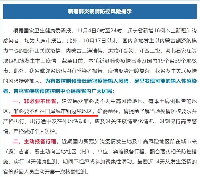 遼寧省政府發(fā)布通知稱,為有效控制和降低新冠疫情輸入風(fēng)險,盡早發(fā)現(xiàn)可能的輸入性感染者,吉林省疾病預(yù)防控制中心提醒省內(nèi)廣大居民:非必要不出省。建議民眾非必要不去中高風(fēng)險地區(qū)、有本土病例報告的地區(qū),非必要不前往口岸城市和邊境地區(qū)。