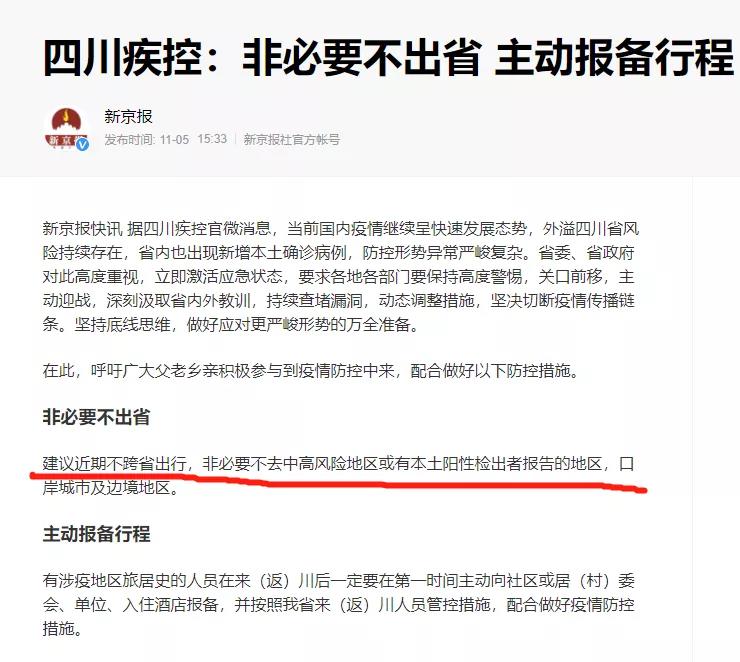 四川省委、省政府建議近期不跨省出行,非必要不去中高風(fēng)險地區(qū)或有本土陽性檢出者報告的地區(qū),口岸城市及邊境地區(qū)。
