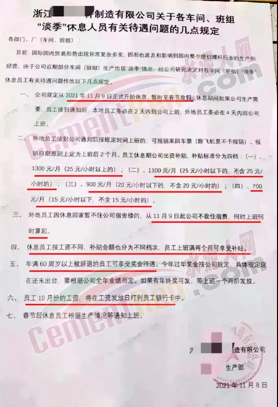 近日,某制造企業(yè)發(fā)布通知稱:從2021年11月9日正式開始休息,暫時(shí)至春節(jié)放假。休息期間如果公司生產(chǎn)需要,員工接到通知后,本地員工務(wù)必在2天內(nèi)到公司上班,外地員工務(wù)必在4天內(nèi)回公司上班。