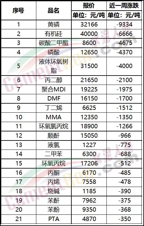 部分化工品近一周跌價(jià)一覽