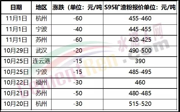 據(jù)水泥人網(wǎng)了解,受鋼價(jià)下調(diào)帶動(dòng),近日長(zhǎng)江沿線及周邊區(qū)域S95礦渣粉報(bào)價(jià)跟降,相關(guān)數(shù)據(jù)顯示,自10月下旬以來,江蘇蘇州兩次下調(diào)礦渣粉價(jià)格,累計(jì)下調(diào)110元/噸;浙江杭州礦渣粉兩次下調(diào)報(bào)價(jià),累計(jì)下調(diào)90元/噸,寧波兩次下調(diào)55元/噸。