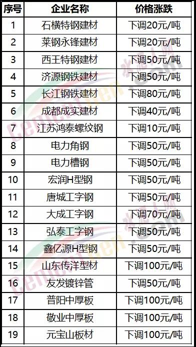 11月9日近20家鋼廠調(diào)價(jià),其中下跌最大為山東傳洋型材,一次性下調(diào)報(bào)價(jià)100元/噸,具體調(diào)價(jià)明細(xì)如下: