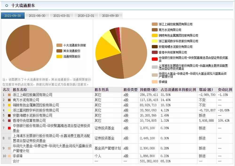 上峰水泥三季報顯示,海螺水泥在今年第三季度新進(jìn)成為公司第5大股東,持股比例為2.49%。