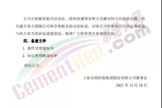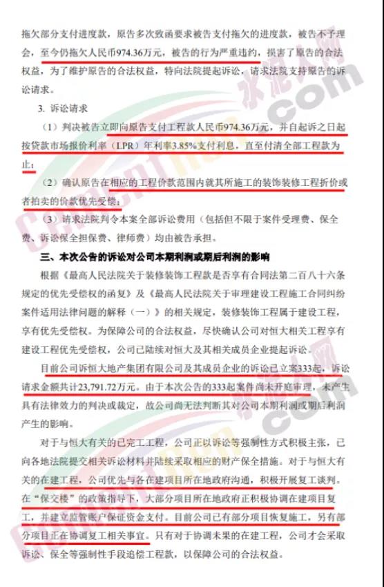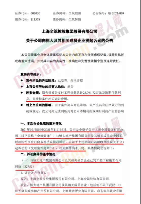 11月17日晚間,全筑股份公告稱(chēng),公司及全資子公司全筑裝飾與恒大地產(chǎn)集團(tuán)及其相關(guān)成員企業(yè)因工程款糾紛事宜已向多地法院提起訴訟。全筑股份訴恒大方面支付工程價(jià)款共計(jì)2.38億元及逾期付款利息,并承擔(dān)案件相關(guān)訴訟費(fèi)用。全筑股份表示,正積極采取司法訴訟、政府協(xié)調(diào)等多種方式解決恒大應(yīng)收款問(wèn)題。