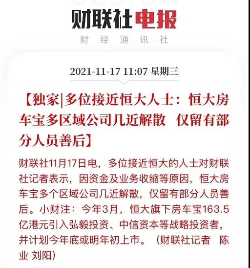同期,多位接近恒大的人士表示,因資金及業(yè)務(wù)收縮等原因,恒大房車(chē)寶多個(gè)區(qū)域公司幾近解散,僅留有部分人員善后。