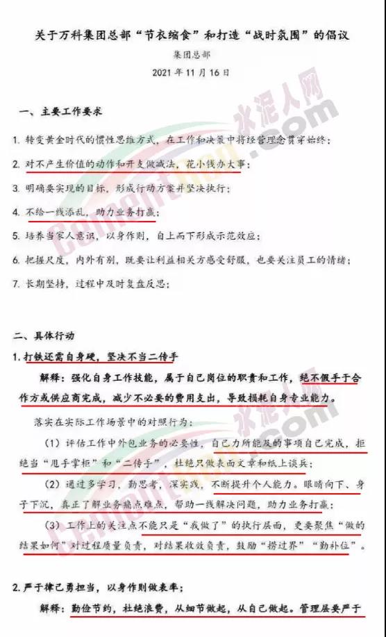 同期,萬(wàn)科總部下發(fā)了一份主題為《關(guān)于萬(wàn)科集團(tuán)總部“節(jié)衣縮食”和打造“戰(zhàn)時(shí)氛圍”的倡議》,共提出7點(diǎn)工作要求兩條具體行動(dòng)。