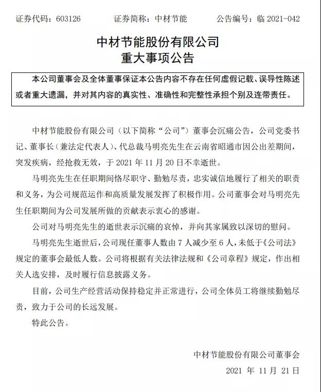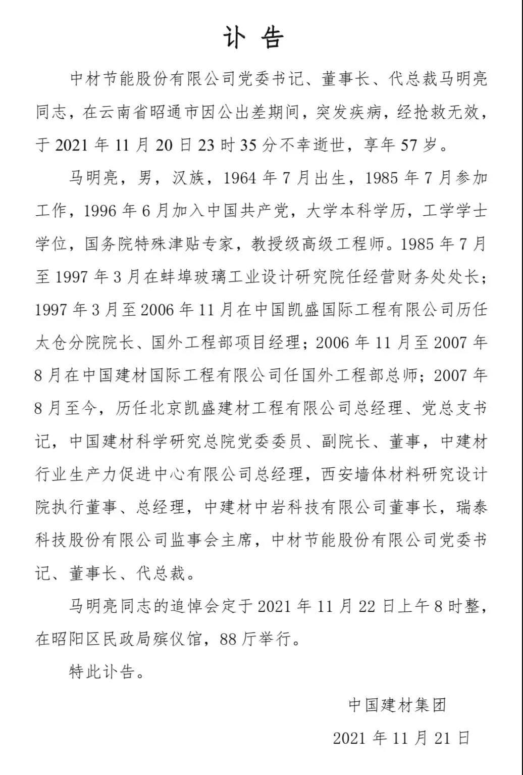 11月21日中國(guó)建材集團(tuán)發(fā)布訃告稱(chēng),中材節(jié)能股份有限公司黨委書(shū)記、董事長(zhǎng)、代總裁馬明亮同志,在云南省昭通市因公出差期間,突發(fā)疾病,經(jīng)搶救無(wú)效,于2021年11月20日23時(shí)35分不幸逝世,享年57歲。