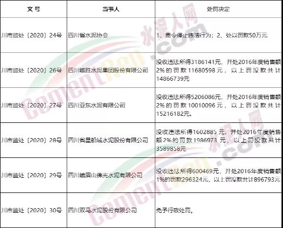 四川省市場(chǎng)監(jiān)督管理局發(fā)布6條《行政處罰決定書》。其中針對(duì)于當(dāng)?shù)厮嘈袠I(yè)的處罰決定書提到案件來(lái)源及調(diào)查經(jīng)過(guò)為:2017年7月,四川省發(fā)展和改革委員會(huì)從多個(gè)途徑收到反映四川省水泥協(xié)會(huì)組織本行業(yè)經(jīng)營(yíng)者聯(lián)合漲價(jià)的舉報(bào)。經(jīng)初步核查后,四川省發(fā)展和改革委員會(huì)于2017年7月20日正式對(duì)四川省水泥協(xié)會(huì)及涉嫌達(dá)成并實(shí)施壟斷協(xié)議的六家水泥經(jīng)營(yíng)者予以立案調(diào)查,總計(jì)處罰3506.9572萬(wàn)元。