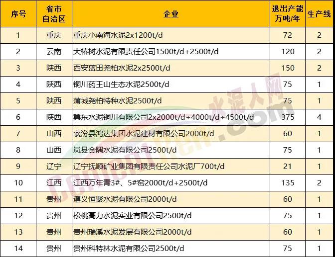 另據(jù)水泥人網(wǎng)不完全統(tǒng)計(jì)今年以來已經(jīng)有20多條水泥熟料生產(chǎn)線發(fā)布關(guān)停拆除消息。涉及陜西 、貴州、山西、江西、云南、重慶、遼寧7個(gè)省市自治區(qū)合計(jì)14個(gè)項(xiàng)目21條生產(chǎn)線。退出產(chǎn)能合計(jì)1428萬噸/年。其中包括冀東水泥銅川有限公司4條熟料生產(chǎn)線,退出產(chǎn)能達(dá)375萬噸/年,以及重慶小南海水泥72萬噸/年熟料產(chǎn)能。