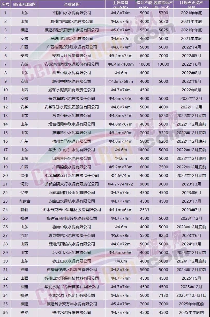 同時(shí),有大量的智能化高產(chǎn)水泥生產(chǎn)線陸續(xù)建成投產(chǎn)。據(jù)不完全統(tǒng)計(jì)從2021年至2025年底前將有37條5340.9萬噸/年。新型干法水泥熟料生產(chǎn)線點(diǎn)火投產(chǎn)。擬于2021年12月-2025年12月期間點(diǎn)火投產(chǎn)部分生產(chǎn)線如下: