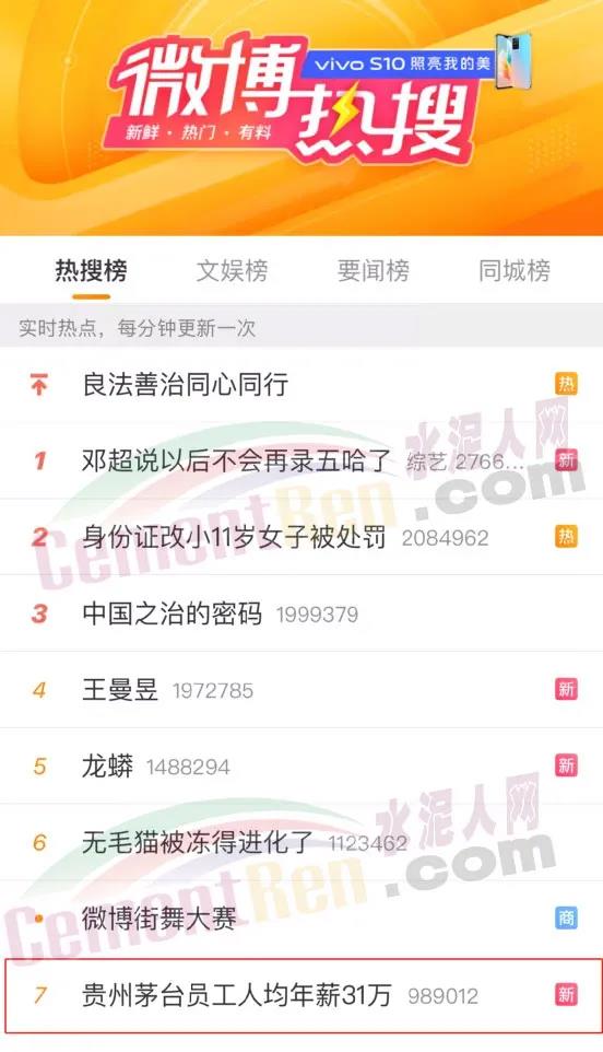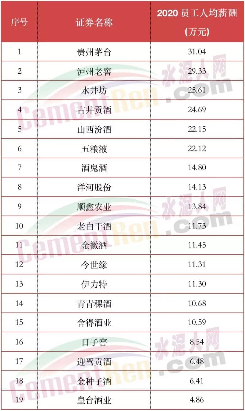 對比上市公司最新公布的水泥行業(yè)高管年薪及員工平均薪酬,水泥行業(yè)18家上市公司,海螺水泥以高管年薪平均158.71萬元/年位于首位,天山股份員工年薪平均131.72萬元/年位于第二位。按最新公布數(shù)據(jù)計算,海螺水泥高管平均年薪較貴州茅臺高出124.81萬元/年,員工平均工資卻低出12.97萬元/年。