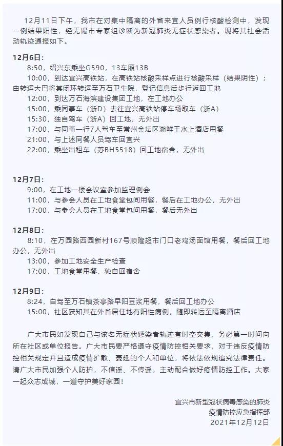 日前 ,江蘇宜興市通報發(fā)現(xiàn)一例新冠肺炎無癥狀感染者。通報顯示,該感染者6日從浙江紹興到宜興,期間在萬石海濱建設(shè)集團(tuán)工地等區(qū)域活動,從其活動軌跡可見,該感染者曾參加監(jiān)理例會和工地安全生產(chǎn)檢查。經(jīng)排查,密切接觸者共63人,次密切接觸者共560人。全部集中隔離并規(guī)范開展核酸檢測,已出結(jié)果均為陰性。