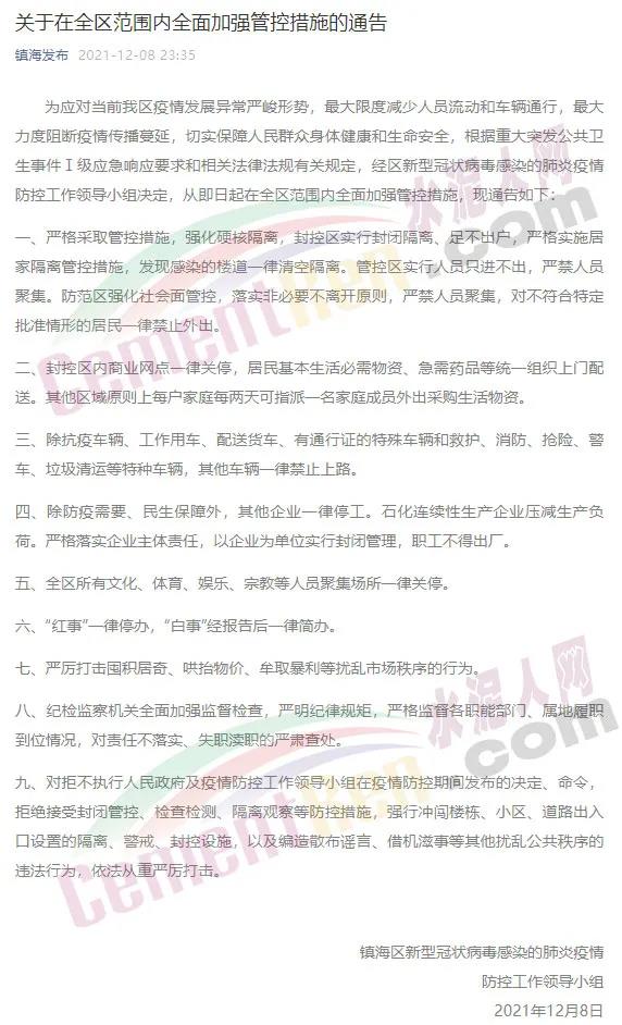 全區(qū)所有工業(yè)企業(yè)一律實施停產(chǎn)防疫,非化企業(yè)12月9日14時起立即嚴(yán)格執(zhí)行停產(chǎn)防疫措施,化工企業(yè)12月9日14時起嚴(yán)格執(zhí)行停止投料,啟動執(zhí)行安全停產(chǎn)方案,有檢維修等作業(yè)的一并執(zhí)行停止作業(yè)。