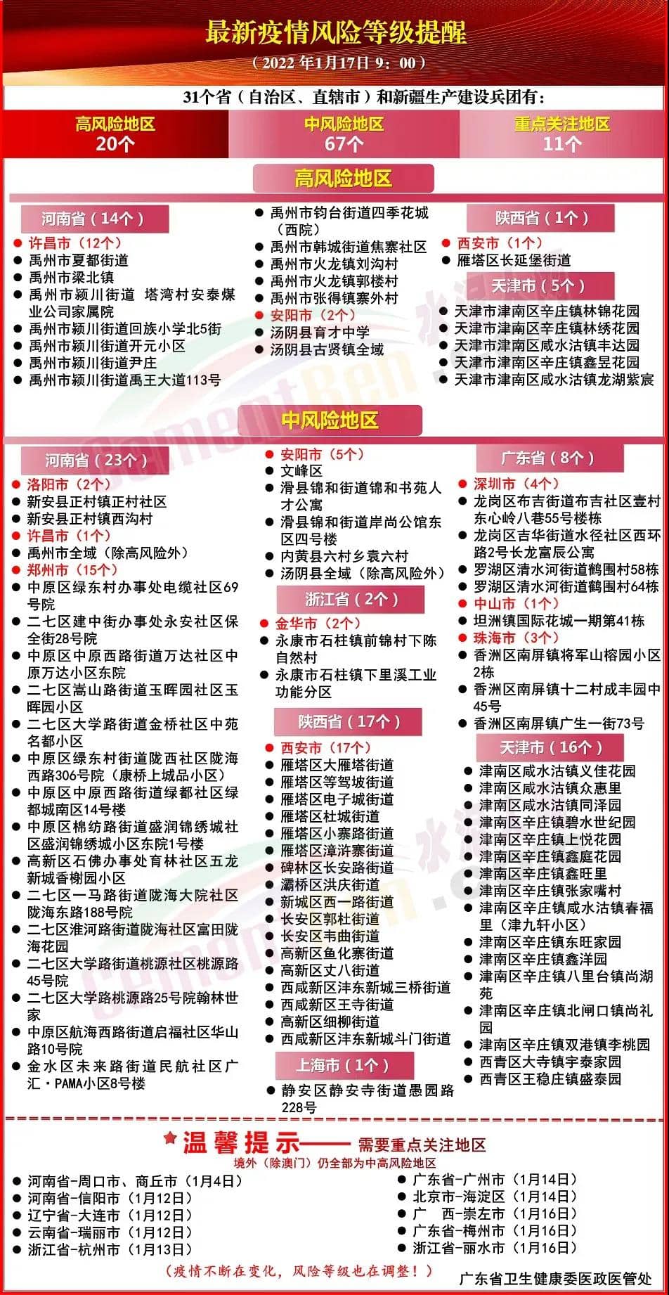 國家衛(wèi)健委消息,1月16日0-24時,31個省(自治區(qū)、直轄市)和新疆生產(chǎn)建設(shè)兵團報告新增確診病例223例。截至2022年1月17日9時,全國疫情:高風(fēng)險等級地區(qū)20個,中風(fēng)險等級地區(qū)67個,重點關(guān)注地區(qū)11個。