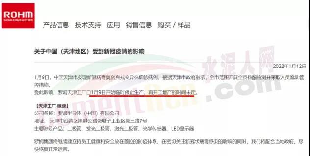 1月12日,日本羅姆半導(dǎo)體 (Rohm Semiconductor)通過官網(wǎng)對外宣布,由于中國天津市發(fā)現(xiàn)新冠病毒奧密克戎變異株確診病例,根據(jù)天津市政府指示,全市范圍開展全員核酸檢測并采取人員流動管控措施。受此影響,羅姆天津工廠自1月9日開始臨時停止生產(chǎn),再度復(fù)工時間未定。